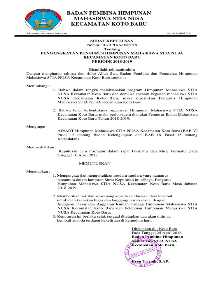 Contoh sk pengurus osis pahli ilhapp. 11 contoh surat keputusan yang baik dan benar dinas organisasi. Organisasi ini dapat berupa organisasi kemahasiswaan intra kampus , organisasi kemahasiswaan antar kampus , organisasi ekstra kampus maupun semacam ikatan mahasiswa kedaerahan yang pada umumnya beranggotakan lintas atau antar kampus. Organisasi kemahasiswaan beranggotakan mahasiswa program sarjana (s1) dan atau program diploma. Contoh surat keputusan organisasi mahasiswa 2011;